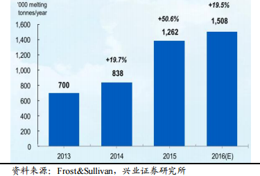 根據(jù)中國有色金屬工業(yè)協(xié)會(huì)硅業(yè)分會(huì)統(tǒng)計(jì)數(shù)據(jù),2016年上半年全球多晶硅產(chǎn)量為19.4萬噸,同比增加14.1%,消費(fèi)量為20.5萬噸,同比增加27.6%,消化庫存1.1萬噸。國內(nèi)多晶硅產(chǎn)量為10萬噸,進(jìn)口多晶硅為7萬噸,出口量為0.6萬噸,因此總供應(yīng)量為16.4萬噸,同比增加22.2%。上半年多晶硅消費(fèi)量為17.15萬噸,同比增加41.6%,因此上半年供應(yīng)量略小于需求0.75萬噸。全球和中國多晶硅上半年均呈現(xiàn)供應(yīng)緊張需求火熱的產(chǎn)業(yè)態(tài)勢,導(dǎo)致多晶硅價(jià)格一路回升,成交價(jià)從2016年1月初歷史最低點(diǎn)約10.54萬元/噸回升至6月末的14.67萬元/噸,漲幅達(dá)到39.2%;而上半年多晶硅均價(jià)為人民幣12.87萬元/噸(約19.2美元/公斤),同比下降0.54%,環(huán)比上漲15.12%。但展望2017年多晶硅價(jià)格,由于眾多企業(yè)意圖在電力成本更低的新疆等地區(qū)設(shè)廠,將進(jìn)一步拉低行業(yè)平均成本,同時(shí)預(yù)計(jì)光伏下游的需求同比下滑,使得多晶硅價(jià)格面臨持續(xù)下調(diào)壓力。