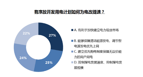 我們看到,有22%的網(wǎng)友認(rèn)為,控制煤電發(fā)展速度、抑制煤電發(fā)展規(guī)模是有序放開發(fā)用電計(jì)劃的關(guān)鍵;幾乎同比例受訪人群認(rèn)為,有序放開發(fā)用電計(jì)劃為電改提速的關(guān)鍵在于能夠保障清潔能源發(fā)電、調(diào)節(jié)型電源發(fā)電優(yōu)先上網(wǎng)(25%)和建立優(yōu)先購(gòu)電制度保障無議價(jià)能力的用戶用電(24%),;另外27%的網(wǎng)友則認(rèn)為,加快建立電力現(xiàn)貨市場(chǎng)將成為電力體制改革新的加速器。