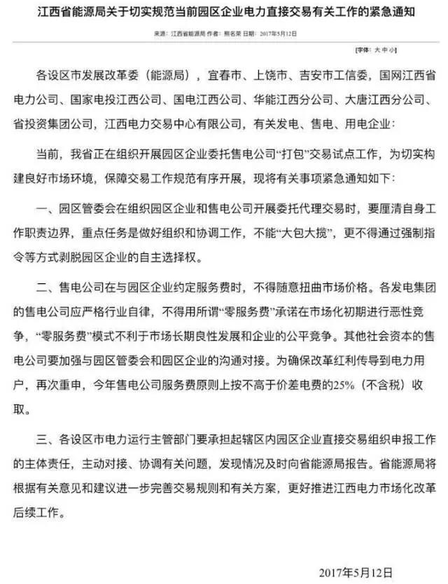 原標題:江西能源局發(fā)布緊急通知:發(fā)電集團售電公司應(yīng)自律;所有售電公司服務(wù)費不得超過價差25%