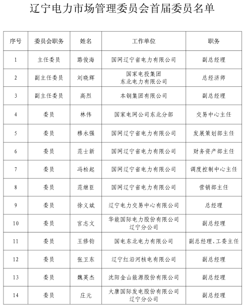 從遼寧電力交易中心獲悉遼寧電力市場(chǎng)管理委員會(huì)正式成立。按照《遼寧省人民政府辦公廳關(guān)于印發(fā)遼寧電力市場(chǎng)管理委員會(huì)給組建方案的通知》有關(guān)要求,遼寧電力市場(chǎng)管理委員會(huì)由發(fā)電企業(yè)、電力用戶、電網(wǎng)企業(yè)、交易機(jī)構(gòu)、第三方機(jī)構(gòu)專家代表構(gòu)成,會(huì)議選舉21名代表為第一屆遼寧電力市場(chǎng)管理委員會(huì)委員。其中,發(fā)電企業(yè)代表6名,從省內(nèi)五大發(fā)電集團(tuán)和核電企業(yè)中產(chǎn)生;電力用戶代表6名,從對(duì)全省實(shí)體經(jīng)濟(jì)發(fā)展貢獻(xiàn)大的冶金、石化、有色、煤炭和裝備制造5個(gè)行業(yè)已參與市場(chǎng)直接交易且用電量居行業(yè)首位的電力用戶代表中產(chǎn)生;電網(wǎng)企業(yè)代表6名,從國(guó)家電網(wǎng)公司東北分部和遼寧省電力有限公司產(chǎn)生。詳情如下: