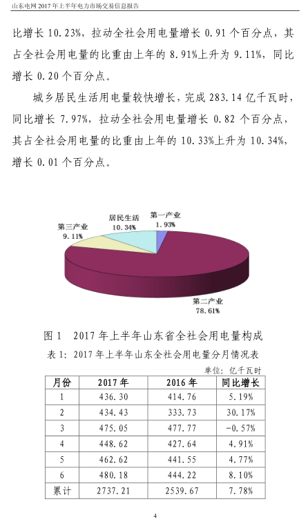 山東電力交易中心日前發(fā)布了《山東電網2017年上半年電力市場交易信息報告》,報告中稱,上半年,山東省全社會用電量完成2737.21億千瓦時,同比增長7.78%。