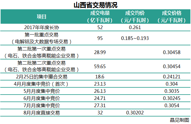 晶見(jiàn)工作室匯總了山西省2017年的10次交易結(jié)果供大家參考,根據(jù)山西的上半年的交易結(jié)果和處在發(fā)電壟斷案被推到風(fēng)口浪尖的時(shí)期進(jìn)行的8月份交易結(jié)果來(lái)看,成交價(jià)格似乎已經(jīng)固定在了0.302~0.306之間。繼續(xù)這種狀態(tài)的話,成交價(jià)格再往下降幾乎不可能。