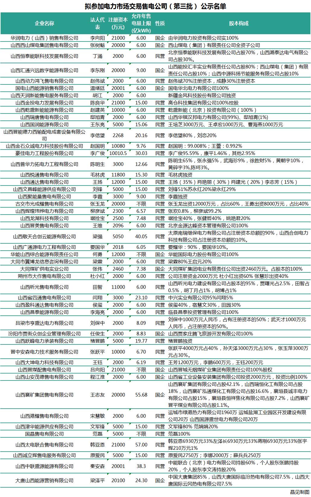 8月8日,山西省經(jīng)信委發(fā)布了擬參加2017年電力直接交易的第三批發(fā)用電企業(yè)公示名單。在此之前(8月4日)還公布了擬參加電力市場(chǎng)交易的第三批售電公司公示名單。本批次公示的售電公司有48家,其中12家屬于國(guó)有企業(yè),
