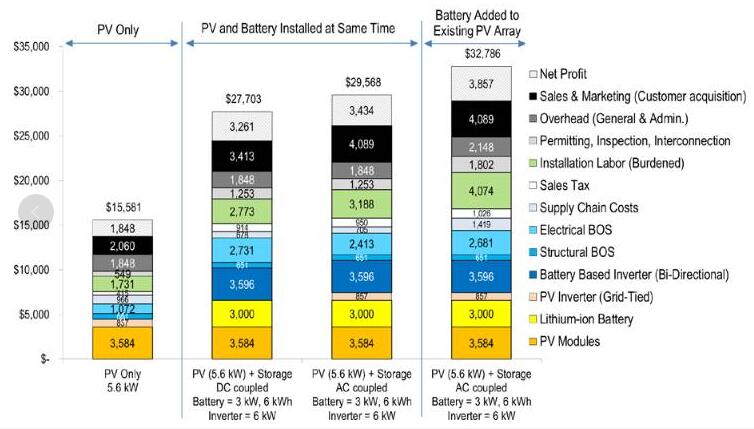 我們發(fā)現(xiàn),使用5.6千瓦太陽能光伏板和3千瓦/6千瓦時鋰離子電池的小型電池案例的基準(zhǔn)價格大約是單一的與電網(wǎng)相連的5.6千瓦太陽能光伏系統(tǒng)的2倍(詳情請參考圖1)。對新裝太陽能光伏+儲能系統(tǒng)而言,直流系統(tǒng)的價格(27,703美元)比交流系統(tǒng)的價格(29,568美元)低1,865美元。交流系統(tǒng)的價格溢價主要是由于交流配置所需的額外并網(wǎng)換流器造成的硬件和人工成本。然而,在對比交流與直流系統(tǒng)時,安裝價格并不是唯一的考慮因素:交流系統(tǒng)在光伏能源即發(fā)即用的應(yīng)用中效率更高,而直流系統(tǒng)則在光伏能源儲存儲的應(yīng)用中更有效率。