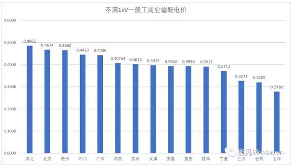 由于輸配電價(jià)的傳遞性,下一電壓等級(jí)包含上一電壓等級(jí)的價(jià)格,所以我們選擇電壓等級(jí)最低的一個(gè)輸配電價(jià),就能大致比較出各省在輸配電價(jià)方面的總體水平。