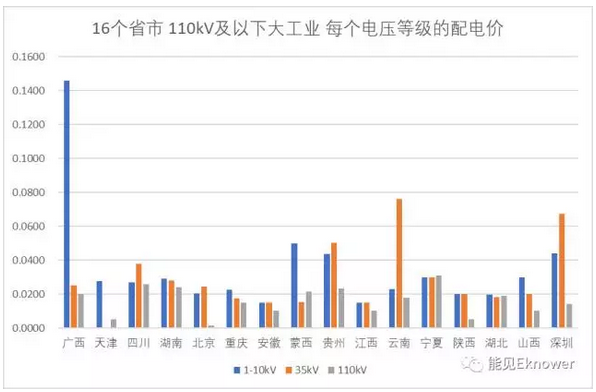 上面我們對(duì)各省市輸配電價(jià)有個(gè)宏觀(guān)認(rèn)識(shí),接下來(lái)我們重點(diǎn)分析對(duì)增量配電網(wǎng)有決定性作用的110kV及以下的配電價(jià)格,為了簡(jiǎn)化分析,我們只針對(duì)增量配電網(wǎng)里占比較大的大工業(yè)用戶(hù)(專(zhuān)線(xiàn)用戶(hù))的配電價(jià)格進(jìn)行分析。