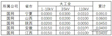 這些省市包括北京、陜西、安徽、江西、天津,110kV及以下大工業(yè)配電平均價(jià)格在0.0408元/KWh。