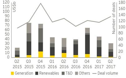 2017年二季度,全球電企(電力及公共事業(yè)類(lèi)企業(yè))交易總價(jià)值達(dá)308億美元,與去年同季度相比下滑32%,其中包括61億美元的可再生能源交易。