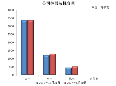 公司裝機(jī)結(jié)構(gòu)不斷優(yōu)化,發(fā)展重心不斷調(diào)整。截至2017年6月末,公司控股裝機(jī)容量5245.94萬(wàn)千瓦,其中:火電裝機(jī)3374.75萬(wàn)千瓦;水電裝機(jī)1314.68萬(wàn)千瓦;風(fēng)電裝機(jī)535.31萬(wàn)千瓦;太陽(yáng)能裝機(jī)21.2萬(wàn)千瓦。公司60萬(wàn)千瓦及以上煤電機(jī)組占全部煤電裝機(jī)的59.44%,超臨界煤電機(jī)組占全部煤電裝機(jī)的56.48%,清潔可再生能源裝機(jī)占全部裝機(jī)的35.67%,生產(chǎn)指標(biāo)持續(xù)改進(jìn),核心競(jìng)爭(zhēng)力不斷增強(qiáng)。