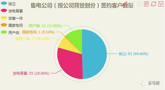 按公司背景分,獨(dú)立售電公司簽約了91家客戶,發(fā)電企業(yè)簽約55家客戶,發(fā)售一體企業(yè)簽約15家客戶,國網(wǎng)公司簽約1家,用戶側(cè)企業(yè)簽約22家客戶。