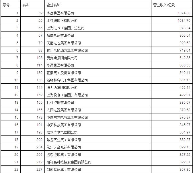 東方日升新能源股份有限公司、安徽天康(集團(tuán))股份有限公司、上海置信電氣股份有限公司以約70億元的營業(yè)收入位居制造500強最后幾位。
