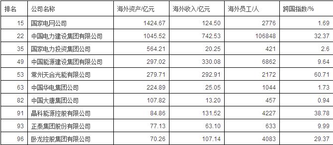 10家電能企業(yè)入榜2017中國100大跨國公司。這10宜賓跨國電能企業(yè)海外資產(chǎn)為4176億元,海外收入為1850億元,海外員工為129523人。