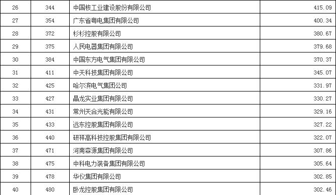 德力西、中天科技、遠(yuǎn)東控股集團(tuán)等知名電氣設(shè)備制造商分列322、411、433名。