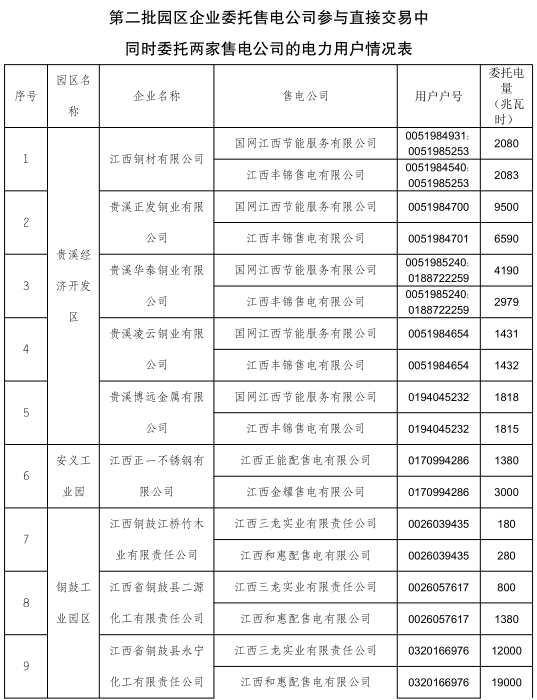 這11家電力用戶為:江西銅材有限公司、貴溪正發(fā)銅業(yè)有限公司、貴溪華泰銅業(yè)有限公司、貴溪凌云銅業(yè)有限公司、貴溪博遠金屬有限公司、江西正一不銹鋼有限公司、江西銅鼓江橋竹木業(yè)有限責(zé)任公司、江西省銅鼓縣二源化工有限責(zé)任公司、江西省銅鼓縣二源化工有限責(zé)任公司、江西省銅鼓縣永寧化工有限責(zé)任公司、江西金柱實業(yè)有限公司、銅鼓縣南山宇宙銀粉廠。這11家電力用戶的合計電量為93048兆瓦時。