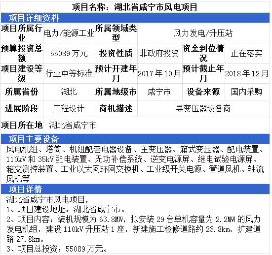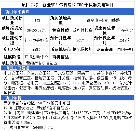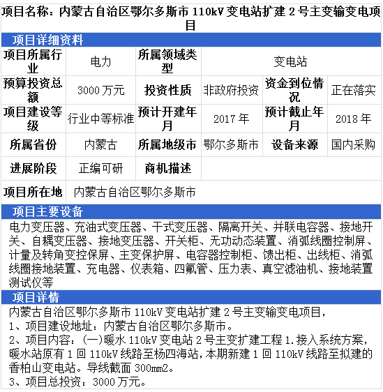 新疆維吾爾自治區(qū)750KV輸變電項目、湖北省咸寧市風電項目、內(nèi)蒙古自治區(qū)鄂爾多斯市110kV變電站擴建2號主變輸變電項目,最高項目總投資達55089萬元。項目主要設備有:電力變壓器、充油式變壓器、干式變壓器、隔離