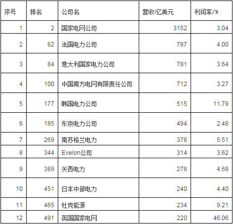 《財富》2017年世界500強中12家電網(wǎng)企業(yè)共完成營收8105億美元,實現(xiàn)利潤431億美元,利潤率為5.31%(規(guī)模最小的英國國家電網(wǎng)利潤應該不正常,利潤率達46%位居500強第一,其他11家的平均利潤率為4.18%)。國家電網(wǎng)以3152億美元的營收高居500強第2位,利潤率為3%,位居500強第286位,在12家電網(wǎng)企業(yè)中居倒數(shù)第2位。南方電網(wǎng)營收為712億美元,居500強第100位,居12家電網(wǎng)企業(yè)第4位,利潤率為3.3%,位居500強第274位,在12家電網(wǎng)企業(yè)中居倒數(shù)第3位。中國的2大電網(wǎng)在全球電網(wǎng)企業(yè)中規(guī)模居前,但贏利能力不強。