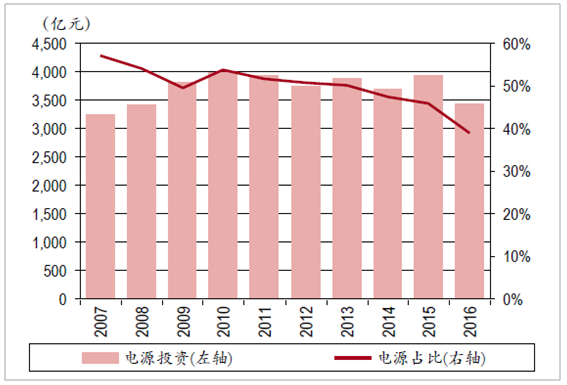 電源投資停滯不前:受電力供需形勢寬松的影響,近年來我國電源投資總額基本處于3,000-4,000億元水平,且在電力總投資額中所占的比例不斷下降。