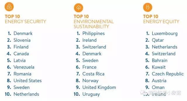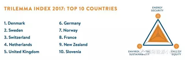 由于以上三個維度相互聯(lián)系,也在一定程度上有所矛盾,所以也可稱為“三難問題”。WEC按照以上三個維度對125個國家和地區(qū)的能源系統(tǒng)進行綜合評估,排在前10位的國家是:1)丹麥、2)瑞典、3)瑞士、4)荷蘭、5)英國、6)德國、7)挪威、8)法國、9)新西蘭、10)斯洛文尼亞。值得注意的是,在這個10個國家中,除了新西蘭以外,全部是歐洲國家。