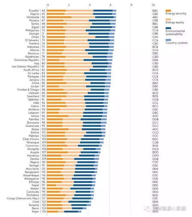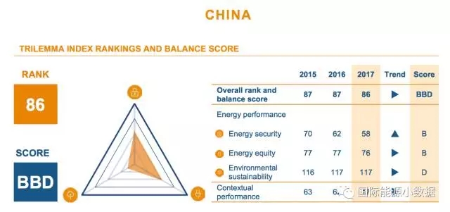 從三個維度分別來看,中國的能源安全指數(shù)表現(xiàn)尚好,排在125個國家中的第58位,高于平均水平;中國的能源公平性排在第76位,略低于平均水平;而環(huán)境可持續(xù)性排在第117位,幾乎墊底。