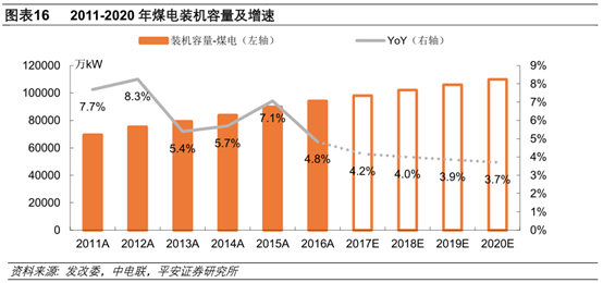 2016年11月至2017年10月的電煤平均價栺為514.94元/噸,假設(shè)2017年供電標準煤耗相比2016年下降1%至309光/千瓦時,則2018年1月1日起燃煤機組平均上網(wǎng)電價相比2014年平均上網(wǎng)電價應(yīng)上調(diào)1.69分/千瓦時??紤]到2016年1月1日的煤電聯(lián)動下調(diào)了3分/千瓦時,那么應(yīng)該上調(diào)4.69分/千瓦時;如果考慮2017年7月1日電價上調(diào)的約1.13分/千瓦時,則仍有3.57分/千瓦時的調(diào)價空間。