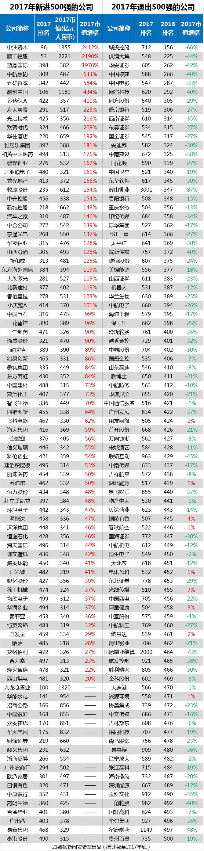 90家公司新晉500強,其中,通過資產(chǎn)重組的中油資本、順豐控股,一年市值增長均超過20倍,進入前100名。