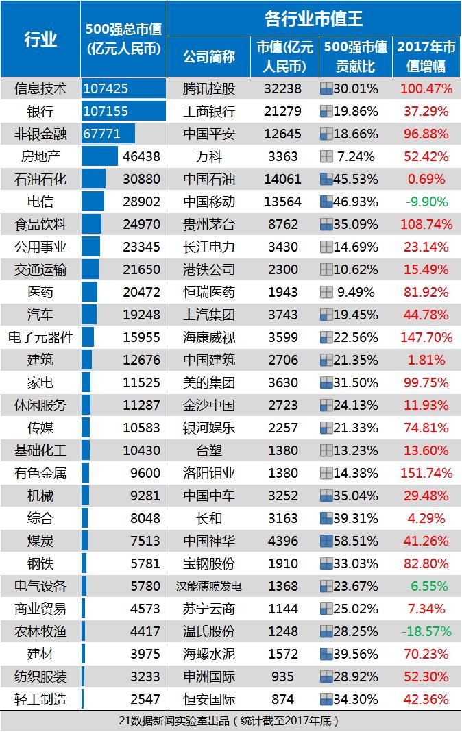 值得注意的是,500強的科技股總市值十年來首次超過銀行。截至2017年底,35家科技類500強總市值為10.74萬億,比28家銀行類500強總市值還高出270億元。