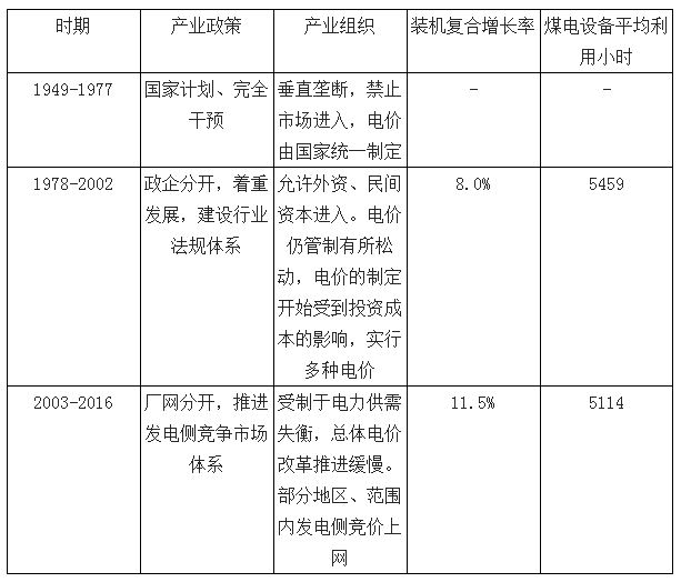 我國(guó)電力工業(yè)的發(fā)展可以劃分為三個(gè)階段:第一階段為1949-1977 年,計(jì)劃經(jīng)濟(jì)嚴(yán)格控制時(shí)期,此時(shí)電力工業(yè)呈現(xiàn)垂直壟斷的特征。第二階段為1978-2002 年,體制改革、市場(chǎng)管理時(shí)期,電力裝機(jī)呈現(xiàn)8.0%的復(fù)合增長(zhǎng)率。第三階段為2003-2016 年,競(jìng)爭(zhēng)市場(chǎng)時(shí)期,電力裝機(jī)復(fù)合增速提升至11.5%。