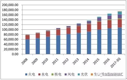 截止到2017年三季度末,我國煤電裝機10.81億千瓦,水電3.39億千瓦,核電3582萬千瓦,風電1.57億千瓦,光伏1.2億千瓦,生物質(zhì)1423萬千瓦;火電裝機占全部裝機容量的61.87%,水電裝機占19.4%,核電占2.05%,風電占9.0%,光伏占6.87%,生物質(zhì)占0.81%。從發(fā)電量來看,2017年前三季度,我國煤電發(fā)電3.45萬億度,水電8147億度,核電1834億度,風電2128億度,光伏857億度,生物質(zhì)568億度。煤電發(fā)電量占比高達71.84%,水電占16.95%,核電占3.82%,風電占4.43%,光伏占1.78%,生物質(zhì)占1.18%。