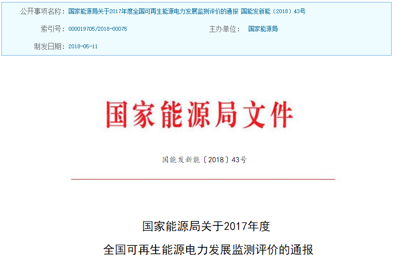 國(guó)家能源局發(fā)布2017年度全國(guó)可再生能源電力發(fā)展監(jiān)測(cè)評(píng)價(jià)的通報(bào)