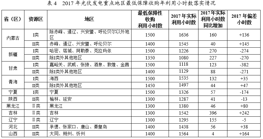 表4 2017年光伏發(fā)電重點(diǎn)地區(qū)最低保障收購(gòu)年利用小時(shí)數(shù)落實(shí)情況