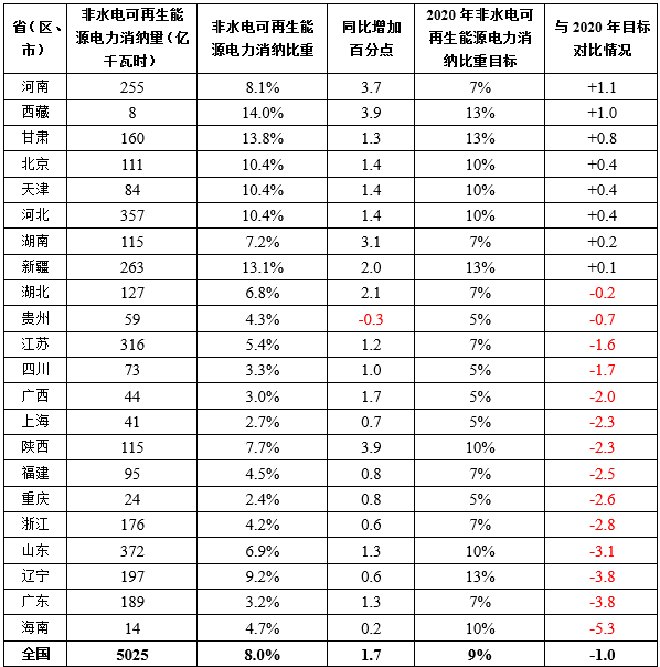 從非水電可再生能源消納比重來看,青海、寧夏、內(nèi)蒙古最高,均超過18%;從非水電可再生能源消納同比增長(zhǎng)來看,西藏、陜西、河南三省(區(qū))同比增長(zhǎng)較快,分別同比上升了3.9、3.9和3.7個(gè)百分點(diǎn);從完成2020年非水電可再生能源電力消納比重目標(biāo)情況來看,寧夏、青海、內(nèi)蒙古等17個(gè)省(區(qū)、市)非水電可再生能源消納比重已達(dá)到2020年目標(biāo),湖北、貴州、江蘇、陜西達(dá)到2020年目標(biāo)的75%以上,廣東、海南、重慶低于2020年目標(biāo)的50%。