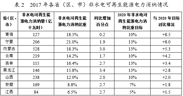 青海。2017年,全部可再生能源電力消納量為446億千瓦時(shí),占本省全社會(huì)用電量的比重為64.9%,同比上升2.5個(gè)百分點(diǎn);非水電可再生能源電力消納量為127億千瓦時(shí),占本省全社會(huì)用電量的比重約為18.5%,同比上升0.2個(gè)百分點(diǎn)。