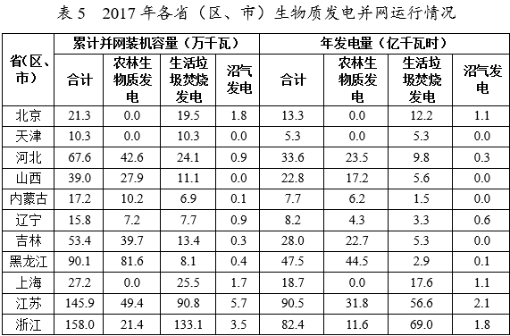 表5 2017年各省(區(qū)、市)生物質(zhì)發(fā)電并網(wǎng)運(yùn)行情況