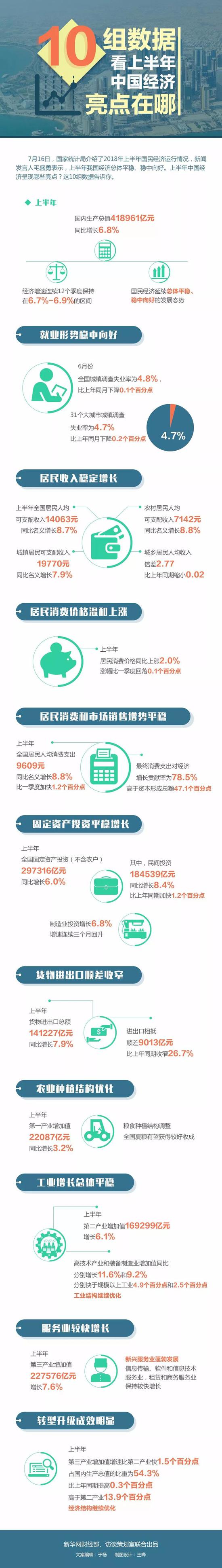 國家發(fā)改委預(yù)測,下半年,我國經(jīng)濟(jì)發(fā)展前景良好。從國際看,雖然國際環(huán)境的不確定性有所加大,但世界經(jīng)濟(jì)復(fù)蘇態(tài)勢仍有望延續(xù),對外經(jīng)貿(mào)合作仍有拓展空間。從國內(nèi)看,改革開放全面深化將不斷激發(fā)市場活力,供給側(cè)結(jié)構(gòu)性改革深入推進(jìn)將不斷提升供給體系質(zhì)量,推動城鄉(xiāng)區(qū)域協(xié)調(diào)發(fā)展將釋放新的發(fā)展?jié)摿?,打好三大攻?jiān)戰(zhàn)將補(bǔ)短板強(qiáng)弱項(xiàng)。我國有條件、有能力實(shí)現(xiàn)年初確定的目標(biāo)任務(wù),促進(jìn)經(jīng)濟(jì)行穩(wěn)致遠(yuǎn)。國家統(tǒng)計(jì)局7月16日發(fā)布了國民經(jīng)濟(jì)半年報(bào),一起來看看我國經(jīng)濟(jì)發(fā)展上半年有哪些亮點(diǎn)?