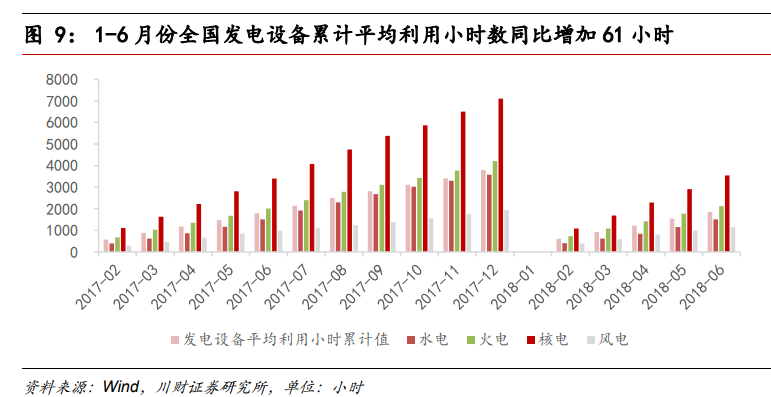發(fā)電量方面:2018 年 1-6 月份,全國(guó)規(guī)模以上電廠發(fā)電量 31945 億千瓦時(shí),同比增長(zhǎng) 8.3%,增速比上年同期提高 2.0 個(gè)百分點(diǎn);火電發(fā)電量 23887 億千瓦時(shí),同比增長(zhǎng) 8.0%,增速比上年同期提高 0.9 個(gè)百分點(diǎn);水電發(fā)電量 4618 億千瓦時(shí),同比增長(zhǎng) 2.9%,增速比上年同期提高 7.1 個(gè)百分點(diǎn);核電發(fā)電量 1300 億千瓦時(shí),同比增長(zhǎng) 12.7%,增速比上年同期回落 6.9 個(gè)百分點(diǎn);風(fēng)電發(fā)電量 1917 億千瓦時(shí),同比增長(zhǎng) 28.6%,增速比上年同期提高 7.7 個(gè)百分點(diǎn)。受益于用電負(fù)荷的增長(zhǎng),全國(guó)發(fā)電量保持較快增長(zhǎng),作為最大負(fù)荷的火電發(fā)電量增速保持較快增長(zhǎng);今年以來(lái)來(lái)水情況較去年同期稍好,水電發(fā)電量同比增加。