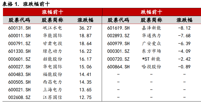 個(gè)股方面,月漲幅居前的個(gè)股為岷江水電、華能國(guó)際、甘肅電投,漲幅分別為 36.27%、18.88%、18.64;月跌幅前三的個(gè)股為嘉澤新能、華通熱力、廣安愛(ài)眾,跌幅分別為 8.12%、7.68%、6.39%。