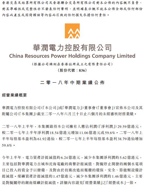 華潤電力:上半年凈利29.59億港元 同比增59.6%
