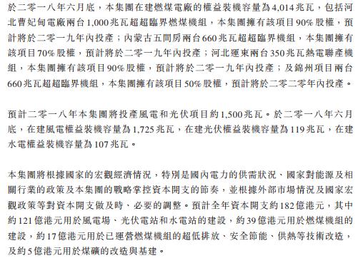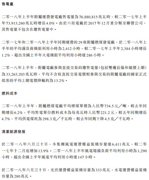 于二零一八年六月三十日,本集團運營權(quán)益裝機容量為36,917兆瓦,其中燃煤發(fā)電廠的運營權(quán)益裝機容量為29,815兆瓦,占比80.8%;風(fēng)電、水電、太陽能及燃氣發(fā)電容量分別為6,411兆瓦、280兆瓦、333兆瓦及79兆瓦,合共占比19.2%,較二零一七年底上升1.8個百分點。二零一八年上半年,本集團新增風(fēng)電和光伏運營權(quán)益裝機容量分別為782兆瓦和58 兆瓦。