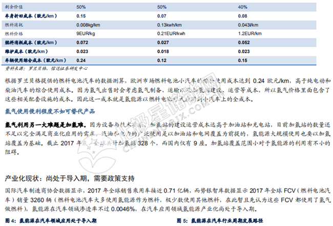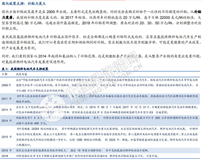 氫能源:綠色零排放,或是能源終極形式。從歷史變遷的縱向角度看,人類利用能源的發(fā)展歷史是不斷走向清潔化的過程,氫能源是目前已知最綠色清潔的能源,其反應(yīng)產(chǎn)物只有水, 因此有望成為能源的終極形式。從橫向?qū)Ρ冉嵌瓤矗瑲淠茉聪噍^于其他形式的能源具有功率密度優(yōu)勢,在發(fā)電領(lǐng)域具有建設(shè)成本優(yōu)勢。目前氫能源應(yīng)用的主要阻礙在于分布式應(yīng)用場景利用綜合成本高,并且氫氣使用的便利性和其他能源相比有較大差距。以全球氫能源乘用車發(fā)展為例,氫能源產(chǎn)業(yè)化應(yīng)用尚處于導(dǎo)入期,需要政策支持。我們認(rèn)為,在各國產(chǎn)業(yè)政策及補(bǔ)貼的推動下,氫能源產(chǎn)業(yè)發(fā)展有向好趨勢,國內(nèi)市場也有望真實(shí)進(jìn)入導(dǎo)入期,但產(chǎn)業(yè)鏈仍需完善。