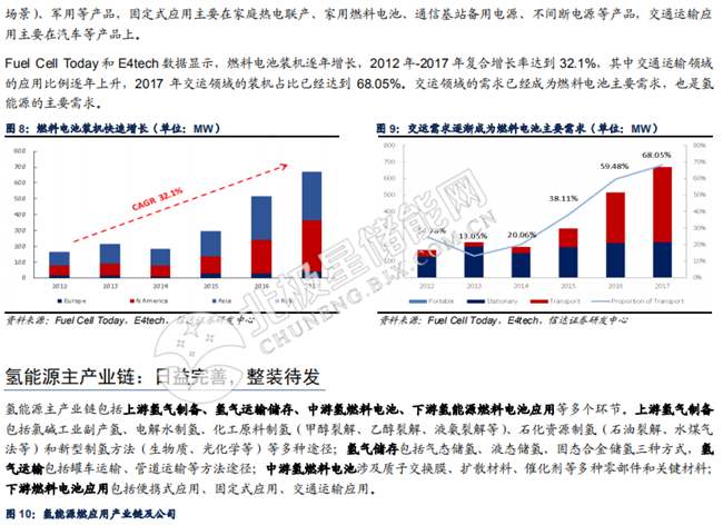 從氫能源非工業(yè)應(yīng)用看:燃料電池是使用氫能源的理想方式,下游交通運(yùn)輸需求漸成主流。氫能源應(yīng)用有多種方式,可以通過傳統(tǒng)熱機(jī)也可以通過燃料電池。由于燃料電池跳出了熱循環(huán)的限制,因而具有更少的能量損失,能量利用效率更高。同時,燃料電池利用氫能源具有噪音小等優(yōu)點(diǎn)。因此燃料電池是氫能源利用的理想形式。氫能源燃料電池下游有便攜設(shè)備、固定式應(yīng)用和交通運(yùn)輸式應(yīng)用,據(jù)國外研究機(jī)構(gòu) Fuel Cell Today 和E4tech 數(shù)據(jù)顯示,交通運(yùn)輸裝載的氫燃料電池量逐年增長,2017 年全球燃料電池裝機(jī)中,交通運(yùn)輸需求占比 68.05%。交運(yùn)需求已經(jīng)成為燃料電池的主要需求,也是氫能源非工業(yè)應(yīng)用的主要需求。