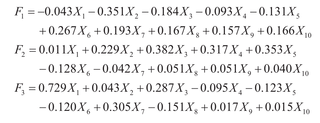 這三個(gè)主成分可以反映基本變量的90.355%,因此可以作為互聯(lián)電網(wǎng)發(fā)展階段的劃分指標(biāo)。采用回歸方法計(jì)算各成分F與基本變量X之間的關(guān)系表達(dá)式如下: