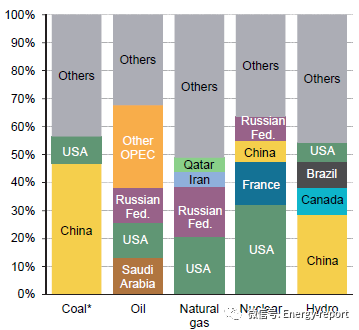 各國(guó)之間的能源產(chǎn)量大相徑庭:對(duì)于每一種燃料,通常不到5個(gè)國(guó)家的該燃料的產(chǎn)量占據(jù)了全世界該燃料產(chǎn)量的一半以上(如圖5所示)。2016年,中國(guó)的煤炭產(chǎn)量就接近了世界煤炭總產(chǎn)量的一半,中國(guó)水電發(fā)電量占全世界水電發(fā)電總量的29%。而美國(guó)和法國(guó)的核電發(fā)電量合計(jì)也幾乎達(dá)到了全世界的50%。沙特、俄羅斯和美國(guó)的原油產(chǎn)量的總和占全世界原油總量的接近40%,而后二者的天然氣產(chǎn)量則達(dá)到了全世界天然氣產(chǎn)量的40%。