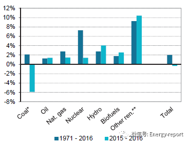 2015年,由于一些區(qū)域天氣條件較差,全球水電發(fā)電量自1989年以來(lái)首次出現(xiàn)了回落,同比下降0.03%,在此之后,水電于2016年出現(xiàn)了大幅度的增長(zhǎng),同比增長(zhǎng)4.0%。同時(shí),水電在全球能源產(chǎn)量中的占比從2015年的2.4%上升至2016年的2.5%。其他可再生能源,如光伏、風(fēng)電、太陽(yáng)熱能、地?zé)崮芫3至艘粋€(gè)快速的增長(zhǎng),其增長(zhǎng)分別為31.1%、14.2%、3.2%和4.0%,但是在全球一次能源生產(chǎn)中的占比仍然小于2%。最后,2016年核的生產(chǎn)占比和增速與2015年相比均未發(fā)生變化,仍然是4.9%和1.4%。