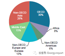 亞洲地區(qū)非經(jīng)合組織國(guó)家(包含中國(guó))的終端能源消費(fèi)量占比從21世紀(jì)初增長(zhǎng)到了2016年的34%。同時(shí),受2008年全球金融危機(jī)的影響,經(jīng)合組織國(guó)家終端能源消費(fèi)不在呈增長(zhǎng)趨勢(shì),終端能源消費(fèi)量在一個(gè)水平上上下波動(dòng),消費(fèi)量為35億噸油當(dāng)量,占比達(dá)38%(如圖12所示)。