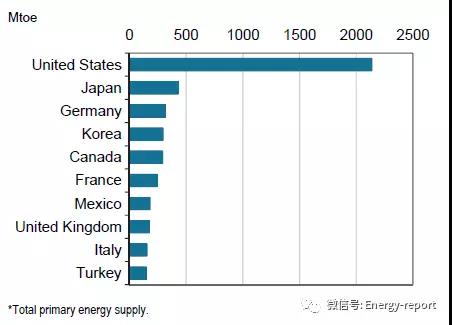 圖14 2017年一次能源供應(yīng)總量前十名的經(jīng)合組織國(guó)家