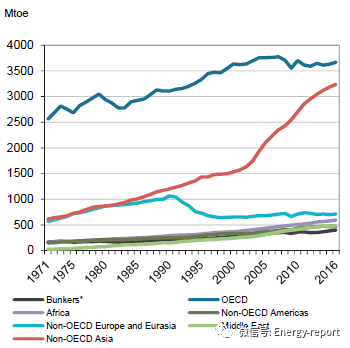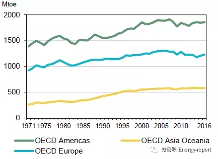 圖25 1971~2016年經(jīng)合組織國(guó)家終端能源消費(fèi)量變化 按區(qū)域劃分