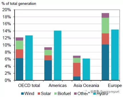 圖23 經(jīng)合組織國(guó)家發(fā)電情況 可再生能源占比 按區(qū)域劃分