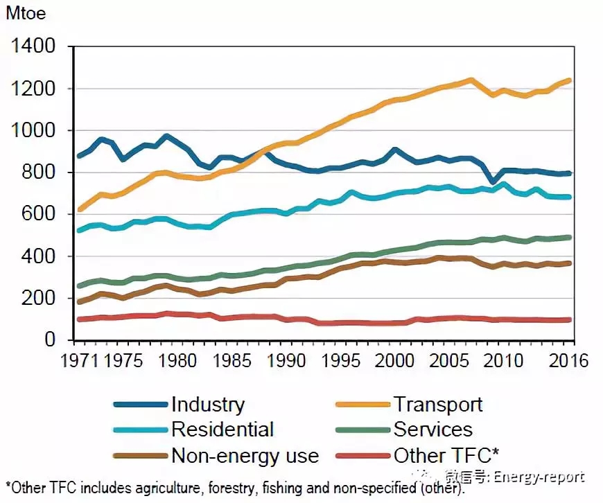 圖26 1971~2016年經(jīng)合組織國(guó)家能源消費(fèi) 按部門劃分