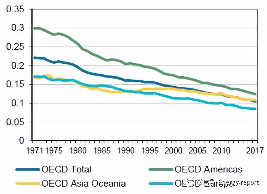 圖31 1971~2017年經(jīng)合組織國(guó)家TPES/GDP 按區(qū)域劃分