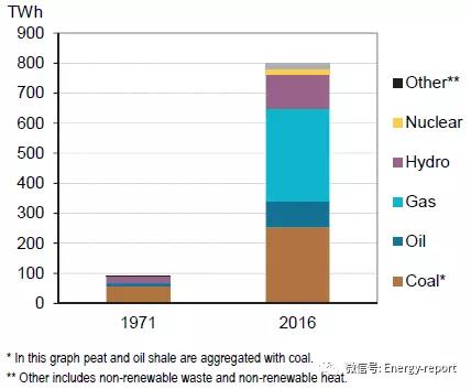 圖10 1971~2016年世界發(fā)電量結(jié)構(gòu)